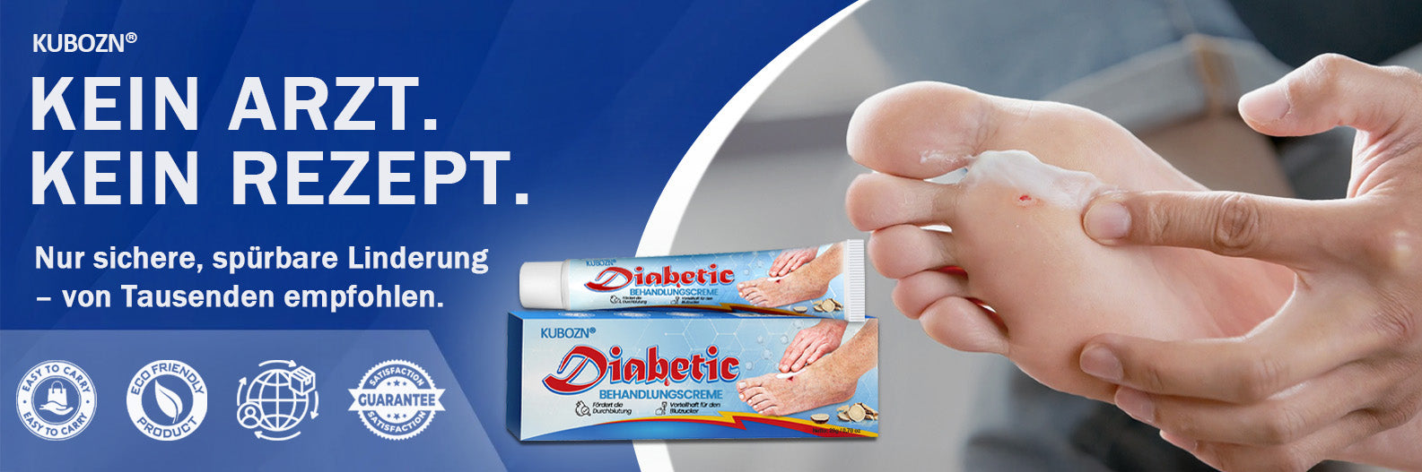 Die KUBOZN® Creme unterstützt die natürlichen Heilungsprozesse und hilft, das Risiko von Entzündungen und Hautschäden zu reduzieren. Sie eignet sich nicht nur für Druckstellen und Fußgeschwüre, sondern auch für kleine Schnitte, Schürfwunden und gereizte Haut – eine ideale Ergänzung für die tägliche Hautpflege bei Diabetes.